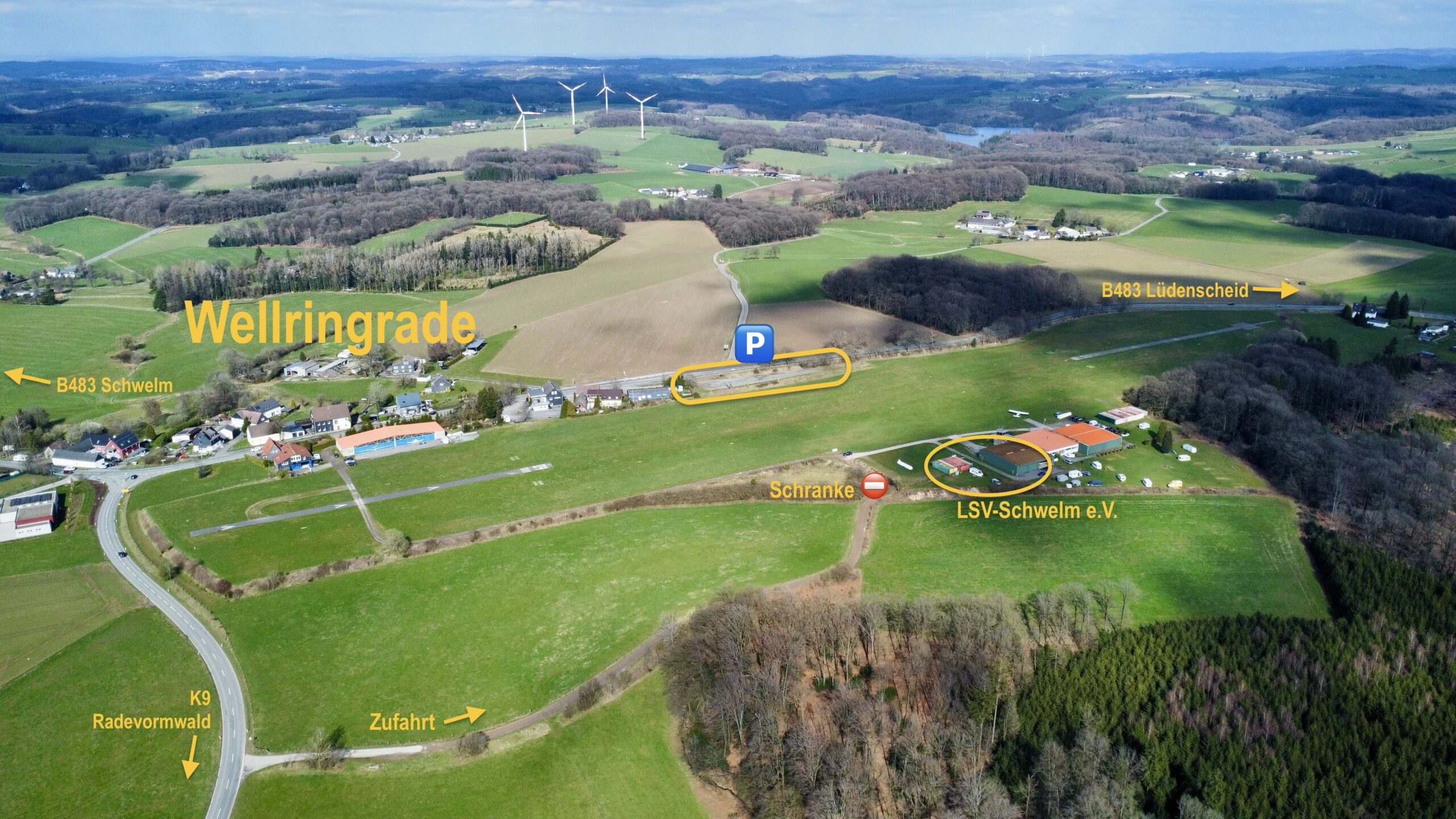 Unser Flugplatz ist ein Segelfluggelände und liegt nördlich der Stadt Radevormwald im Ort Wellringrade. Direkt an der Bundesstraße B483 befindet sich ein Zuschauerparkplatz mit Sitzgelegenheiten, von dort hat man einen sehr guten Blick auf unseren Flugbetrieb.